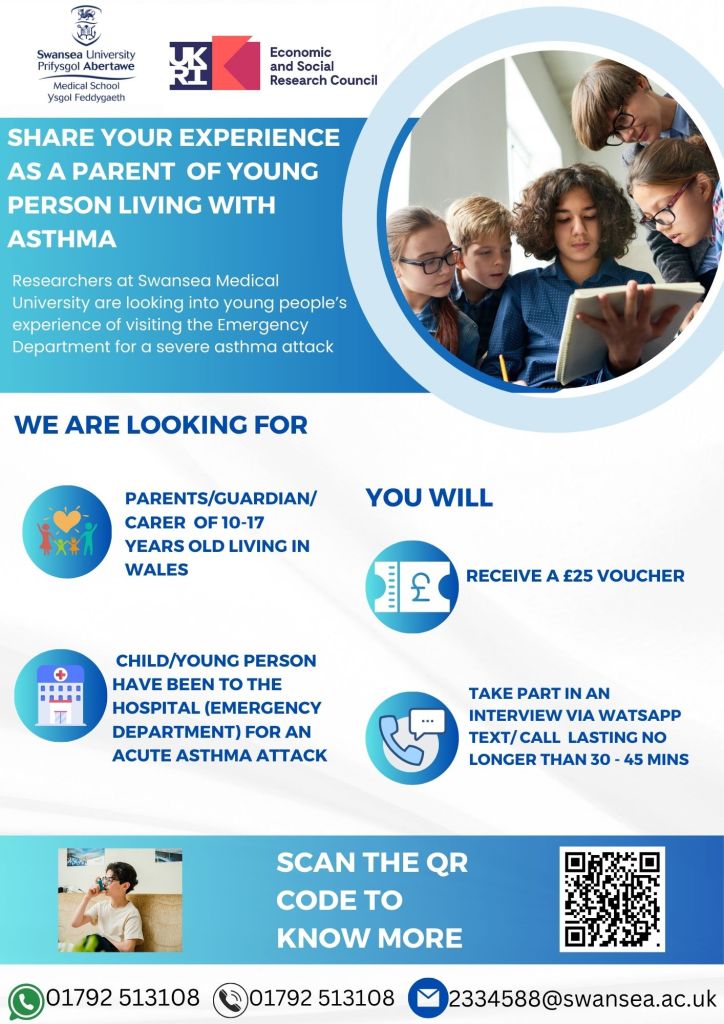 We are trying to understand the experiences of 10 – 17 year olds living in Wales who has used unscheduled emergency asthma care e.g., 999 or 111 calls, unscheduled GP appointments and emergency department visits for sudden severe asthma attacks. We would like to invite your child to participate in our research.