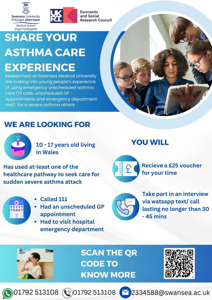 If you are a 10 – 17-year-old living in Wales who has used unscheduled emergency asthma care, e.g., NHS 111 or 999 calls, unscheduled GP appointments, and emergency department visits for a sudden severe asthma attack, and are interested in research, we would like to invite you to participate in our research.